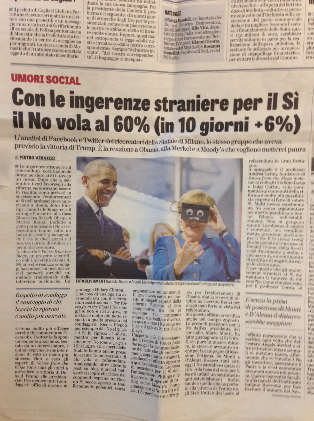 - NEWSPAPERS: Il Fatto Quotidiano (video!), Corriere della Sera (text!), Wired, Il Foglio (text1!) (text2!), Il Giornale (text!), La Verità (text!), Il Sole 24 Ore (text1!) (text2!), ANSA, Repubblica.it, Il Sole 24 Ore.com & others on “Social Flu” (texts!) (video1!) (video2!), L’Unità, event held at the Chamber of Deputies, on “Post-truth and Fake news” (video!), La Voz de Galicia